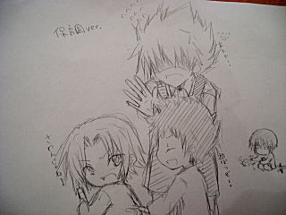 あの子ますます可愛くなってたよこんにゃろうカワユスだったぜうふっ!!(何だよ) 朝はしっかりリボアニ見てから行ったぜ待ち合わせの大画面前!キャフーみこってぃ発見駆け寄ってお互いテンション上がる!!!笑 早速プリハウスまで行って来たぜ!!今日はみこってぃとムクツナなコスプリを撮るって予定立ててたんだ~♪(みこってぃが旅立つ前日に「ツナ持って来て!」と頼んだ/笑) 私は雲雀さんか獄寺でもしようかしらと思ったけど・・・うちは獄受けなんだ!雲獄なんだ!!と思い、「あ、ムクツナならいぃかも最近好きだし」と考え「うち骸するよ!」的なメルを送ったんだ昨日(苦笑) やー見事に人いなかったよだってお昼時狙ったしな(ニヤリ+) うふふー久々な骸はちょっと緊張した!!だってあんなに得意だった骸スマイルが出来なかった最初(汗;) チクショウどうやるんだっけあの黒笑い!笑; でも後からは勘を取り戻しちゃんとムカつく笑みをやり遂げてきましたニコリ! アレだ、クロームしてから全然してないと思われる骸(苦笑) 覚えてるのは・・・去年の5月のドーム以来・・・??あっれそんなにしてないっけ!?; おぉぉぉ自分でもびっくりだ(笑) ふざけて骸の格好でクロームのポーズとか顔作ってみたけど冗談抜きでキモかったので載せるのやめた(あれ吐く!;) オレンジのパイナポーな文字だらけなプリがまるでニコ動のうざぃコメントみたいだね(ニコリ) いっちゃん右のがお気に入り(Sっ気ムンムン!笑) これ楽しかったーSキャラはやってて楽しいw あと「ミルキーはツナの味v」とかも結構お気に入りです(最近自分が本気変態だと思います) それからお気に入りのカフェに行ってお昼ごはん~♪美味しかったよねベーグルサンドvvv みこってぃからお土産の素敵雲雀イラストを貰うハァハァゴロンゴロンゴロンカワユッッッ!!!!!(鼻血) そしてダラダラ歩いて、地下街に入ったら・・・・・∑あれ?!(゜△゜*) 向かい側から歩いてくる人たちの中に友達らしき人が!!すれ違った直後に「●さき!!」と叫ぶと振り向いた。おぉぉぉぉぉぉ本人!!!!!(喜)vvv うわーーーうわーーーーー久しぶり過ぎる!!!2年前も偶然会って、今回も偶然!!高校からの友達でした!!!!!まさか地下街で出会うとはー!凄いね!!!その時だけイントネーションがちょっと鹿児島になっちゃったよ!笑 あ、ちなみにみこってぃと喋る時は博多弁ですょ(・ω・)/デュフw それからみこってぃから絵を描かせられることになったらしく(あれ・・・?笑)とりあえず机がある場所へ移動ってことでDトールへGO!うふふカフェモカLサイズを頼んでウキウキ気分♪♪♪美味しい! ツナとリボ描いてスクとベル描いた! スクの服が分からなかったので私服でってことで。とりあえず水着かなと(何となく)´∀`*あはーv 私だけじゃ不平等だわ!ってことでみこってぃにも描かせる。 「幼稚園児な山獄とツナ先生と隅っこでいぃから雲雀も描いて!」 描 い て く れ た よ こ の 子 っ !!!!!!!!!!!!!!!!! んんんんななななななな何コレーーーーーーーーーーーーーーーーーーー!!!!!!!!!!!!!!!!!!(叫) まままままままさかここここここんなに萌え萌えなイラストを描いて頂けるとはハァハァハァハァハァ!!!!! 隅っこ・・・・・・・・・・・・・・・・・・・・・・・・・・・・・・・・・・・。。。∑(●_●)ぅっ!!!!!??; ↓拡大図↓ _| ̄|Σ・∴'、-=≡○ やっべぇ何この子普っ通に可愛いんですけど(は な ぢ !) おぉぉぉぉぉお持ち帰りしたぁぁぁぁぁぁぁぁぁぁぁぁぁぁぁぁぁぁぁぁい!!!!!!!!!(ゴロンゴロンゴロン!!!) あぁぁぁぁぁぁぁぁぁ家宝じゃ!!!!!!!!!!家宝じゃぁぁぁぁぁ!!!!!!!!!!!!!!!あたいこれ死ぬ時棺桶に入れて貰うもんね!!!(どんだけ~!!) 本当にありがとうみこっちゃん大好きだよぶちゅぶちゅちゅー!!!(汚い寄るな触るな来るな!) そして落ち着いたところで・・・・・忍たまの話になりました!笑 みこってぃ今忍たまにものっそハマってるんだよ!!!私も昔は大好きだったけど、1年は組のメインな3人しか分からなくてさー。普通に見てて面白かったし!昔は家帰ったら忍たま⇒天テレだったからね(懐かしい+) それで資料渡されて初の忍たまキャラ描いて来ました!見たことあるキャラでかっこいぃと思ってたキャラだったよ!名前初めて知ったよ!!伊作ですってよ!!!先輩なんだってさへぇぇぇぇー(゜∀゜*) 何かいろいろ語ってくれましたみこっちゃん!笑 画像見ながら話聞いてたら見たことある人物だったり昔見たことがある話の内容だったり、そゆのが結構あって楽しかったです!!!!!!!!!! てゆか土井先生とキリ丸は同棲してたのか知らなんだ!!!!!; 何それもうハァハァしたわよその話!!!!!そこでさり気なく四カカを少しプッシュしてみた(byナルト) 四代目の家にカカシ先生がお泊まりしてるという同人誌を持っていますが何か!?ハァハァ あと伊作は見た感じだと受けか!(いきなり) てゆかみこってぃの携帯に貼ってある数字の意味がようやく分かったよ139って!笑 でも表は相変わらず27がご健在で良かったよニコリ+笑 今度鹿児島で忍たま合わせ